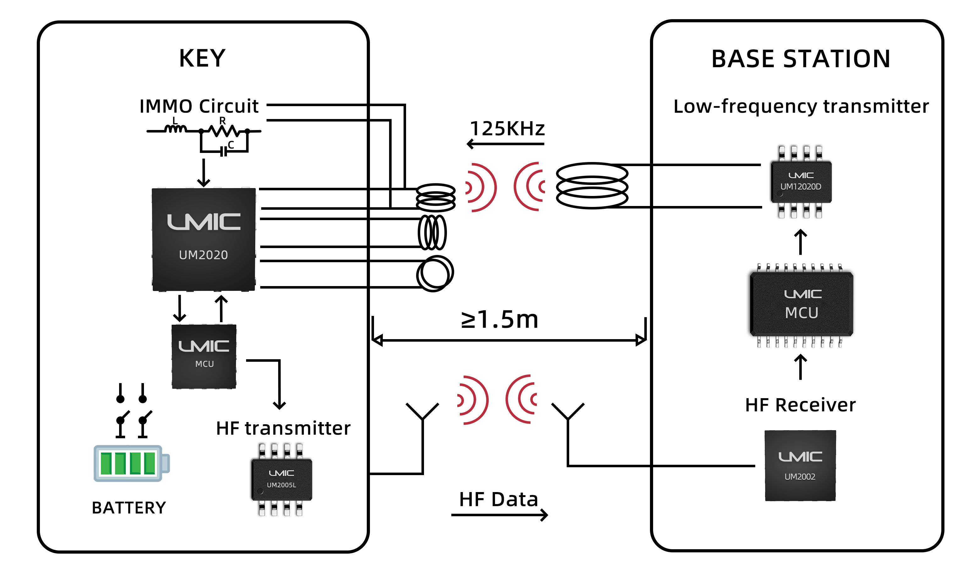 廣芯微基于低功耗高性能低頻接收SoC芯片UM2082F08、FSK(OOK)發射芯片UM2001(或2.4G發射芯片UM2052)組成的鑰匙方案,以及采用廣芯微低功耗32位MCU芯片UM3213A、FSK(OOK)接收芯片UM2002(或2.4G接收芯片UM2052)組成基站發射端,構成完整PKE解決方案。